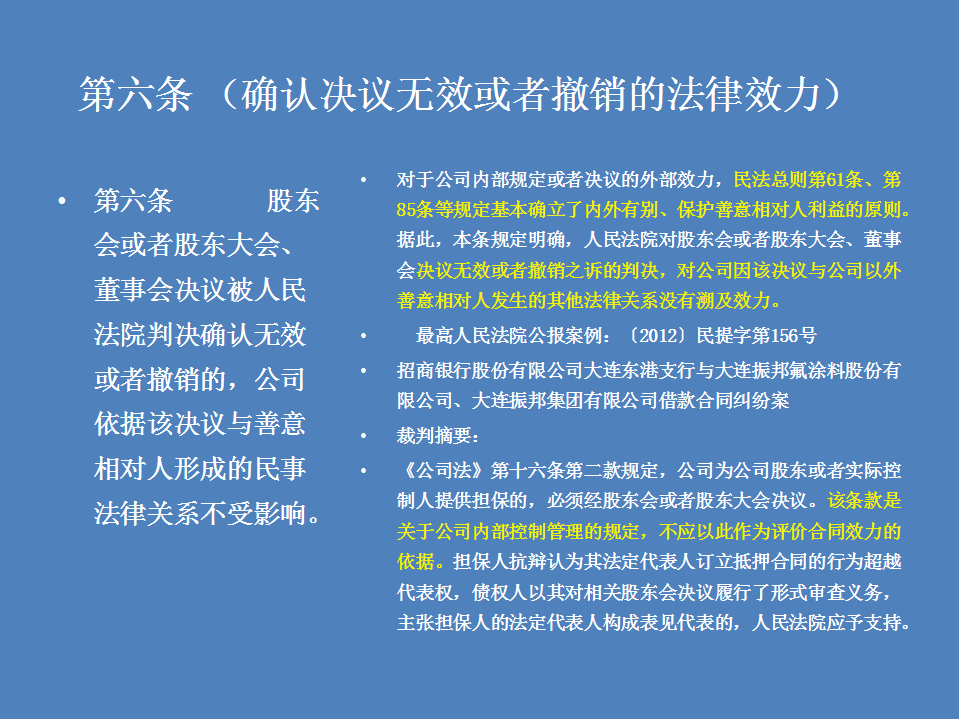 吴老师为此次讲课作了悉心准备,制作了精美的PPT,并对整个司法解释的条文进行了分类概括讲解,如“决议之诉”、“股东知情权”、“利润分配请求权”、“优先购买权”、“股东代表诉讼”等。讲课时,吴老师既阐述理论又结合案例,深入浅出、生动活泼。